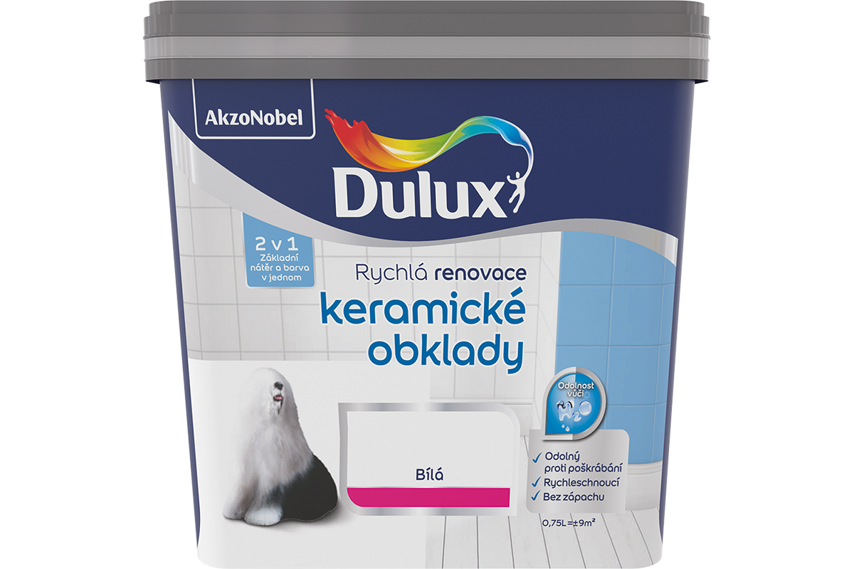 Rad Dulux Rýchla renovácia Keramické obklady je vysokokvalitný, univerzálny, vodou riediteľný náter, ideálny na rýchlu renováciu rôznych povrchov, ako sú dlaždice, keramika, mramor a porcelán. Náter sa vyznačuje vysokou odolnosťou proti mechanickému opotrebovaniu vrátane dočasného kontaktu s vodou vrátane spŕch a vynikajúcim dekoratívnym efektom. Náter je určený na použitie v interiéri, bez potreby použitia základného náteru, rýchlo schne a je tiež bez zápachu. Vybrať si môžete zo štyroch odtieňov – bielej, krémovej, sivej a škandinávskej sivej. Viac informácií nájdete na www.dulux.sk.