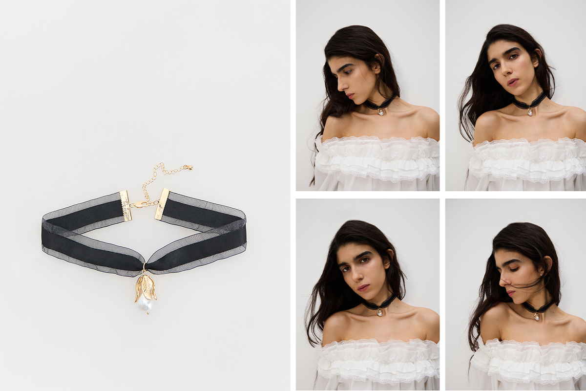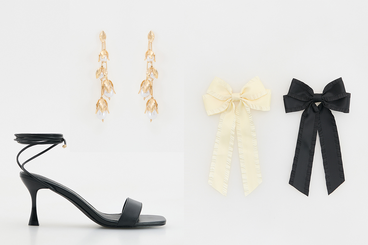 K doplnkom patria čierne sandále s podpätkom, kabelka s retiazkou, veľké náušnice v tvare konvalinky a dve saténové mašle do vlasov. Okrem toho je tu veľká kvetinová brošňa osadená kameňmi, ktorá sa predáva spolu s elegantným vypasovaným čiernym sakom.