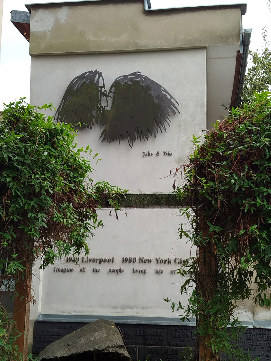 Dom, ktorý upúta už z ulice, je neprehliadnuteľný. Na jeho plote visia farebné portréty Johna Lennona, Paula McCartneyho, Georgea Harrisona a Ringa Starra a fasáda nesie slávne texty piesní ako „Let It Be“ či „All You Need Is Love“. No to je len začiatok.