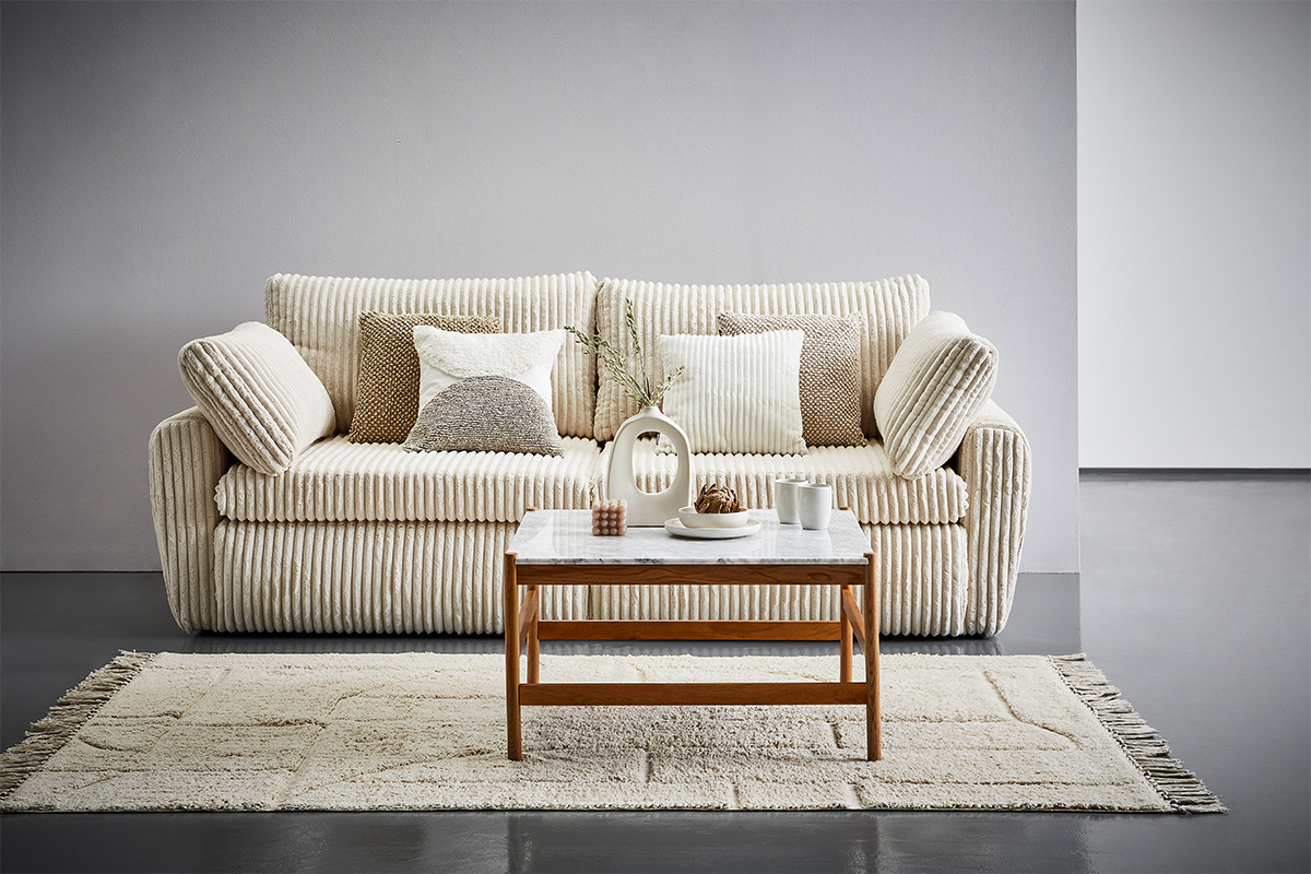 Na rok 2026 má XXXLutz v ponuke aj niekoľko nových produktov, ktoré odrážajú tento trend – od čalúnených postelí a pohoviek v krémových odtieňoch až po elegantné nástenné police, svietidlá a keramiku inšpirovanú „obláčikovou“ bielou.
