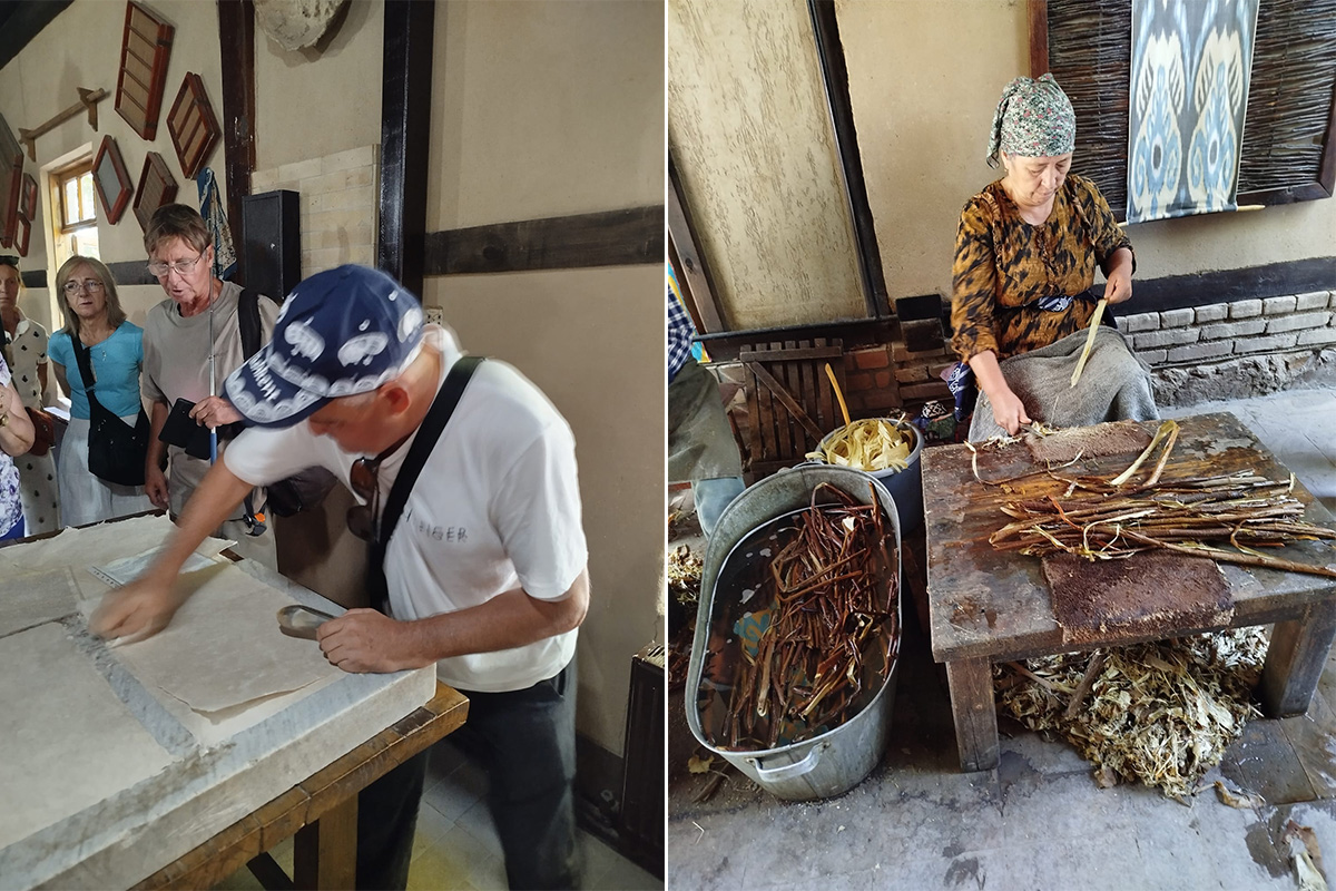 Samarkand však nie je len o histórii. V malej dedinke Konigil, len pár kilometrov od mesta, sa nachádza tradičná dielňa na výrobu hodvábneho papiera, ktorej korene siahajú do 8. storočia. Remeselníci tu dodnes ručne vyrábajú papier z proteínových vlákien, ktoré tvoria zámotky (kukly) húseníc motýľa priadky morušovej, pomocou starobylých techník – drvenie, máčanie, lisovanie a sušenie. Výsledkom je pevný, jemný papier, na ktorý sa kedysi písali najdôležitejšie knihy v strednej Ázii.